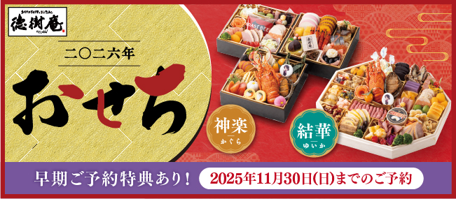 ワンランク上の季節限定メニュー。四季彩豊かな食材をふんだんに使用し、徳樹庵ならではの充実な品揃えに。四季折々の味を盛り込んだ「今」しか食べられない贅沢な料理を、存分にお召し上がりください。