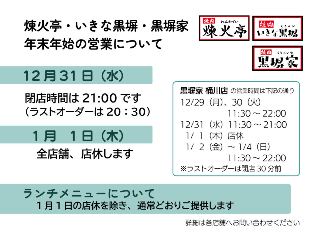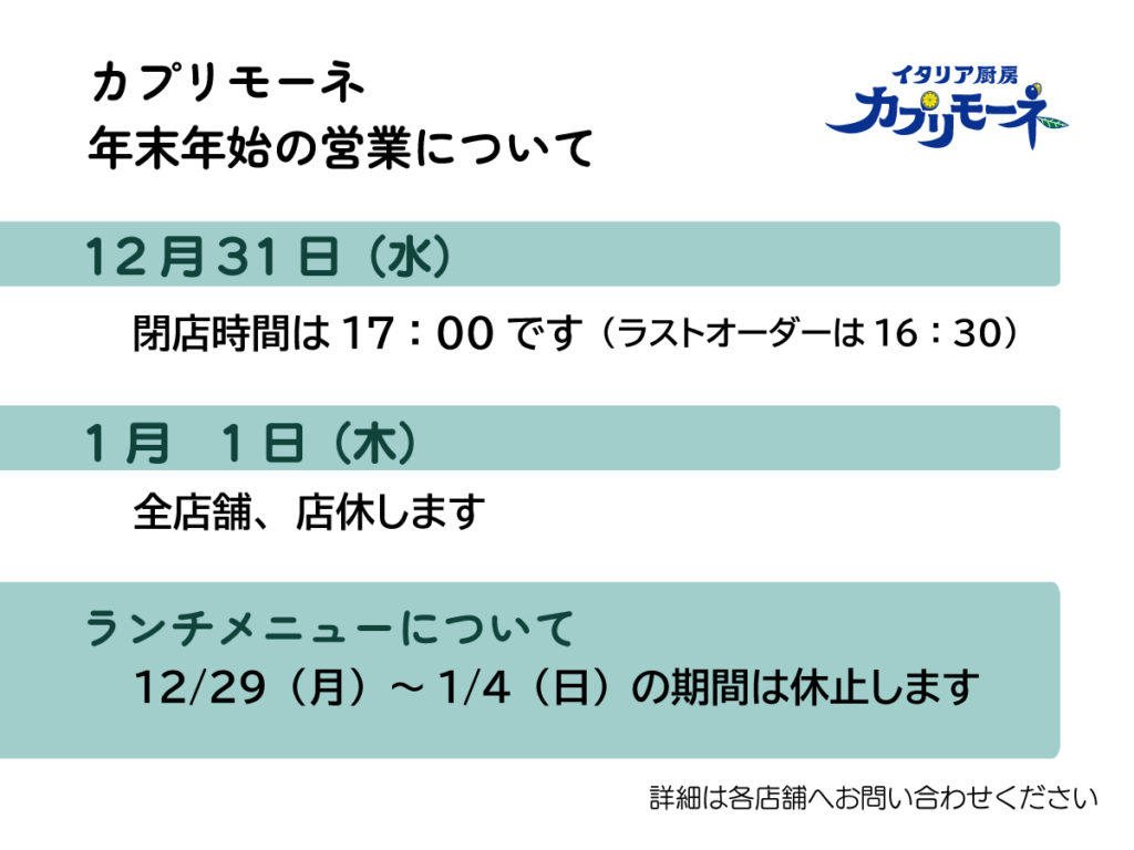 各ブランドの年末年始の営業と、ランチメニュー休止についてお知らせいたします。みなさまにはご不便をおかけして申し訳ございませんが、ご了承くださいますようお願い申し上げます。
