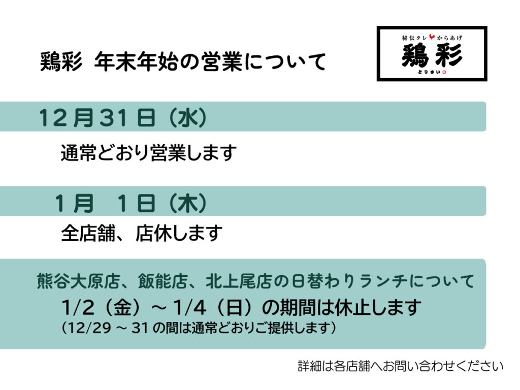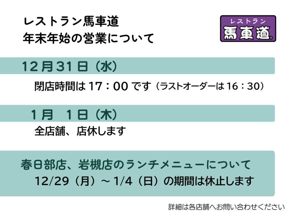 2025年~2026年 年末年始の営業とランチメニュー休止のお知らせ