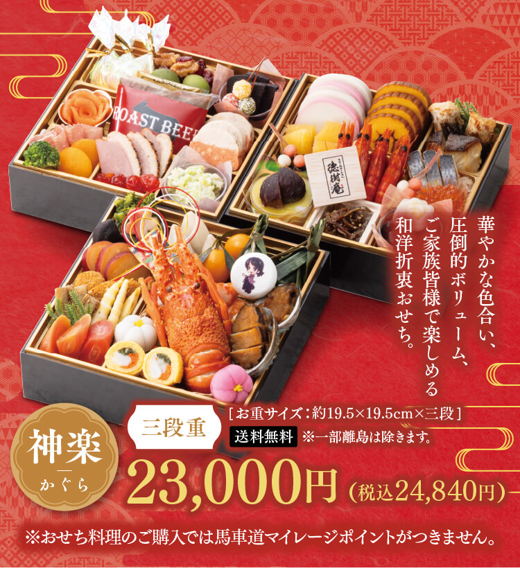 一段目に相応しく、ロブスター、アワビ等を華やかに盛り込みました。馬車道公式キャラクターのやばねちゃんがお迎えします。