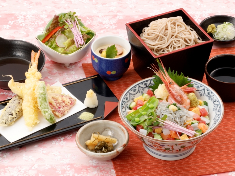 そば・寿司・天ぷらをメインに、ご家族皆さまでお楽しみいただけるメニューを取り揃えました。そばは自社工場で毎日製造し、こだわりのそばつゆをご用意しております。ひと手間かけたおいしさをご賞味ください。